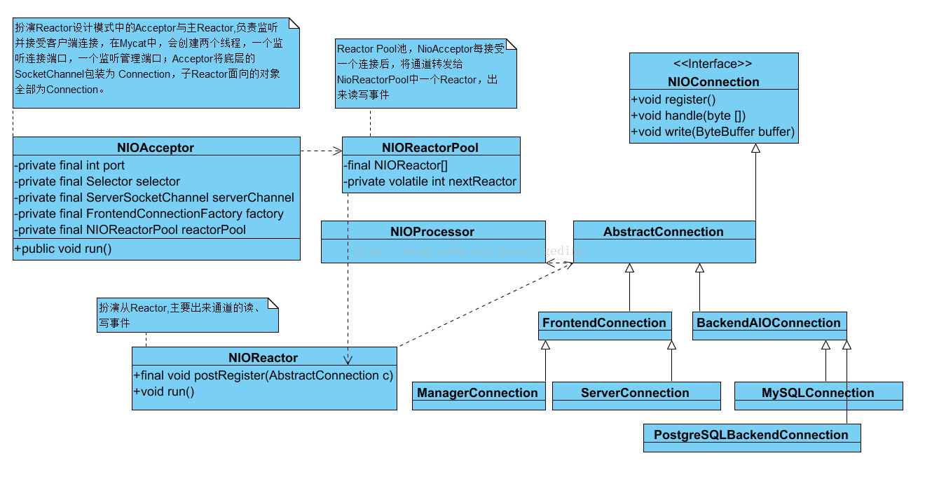 Mycat 使用的线程模型也是基于 Reactor 主从设计模式,其设计类图如下: