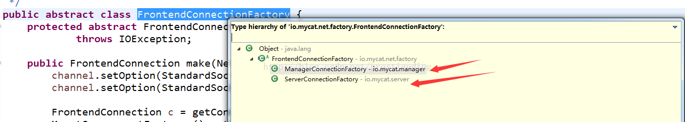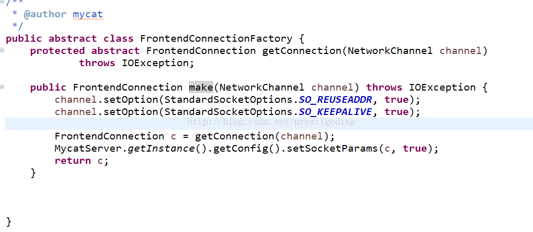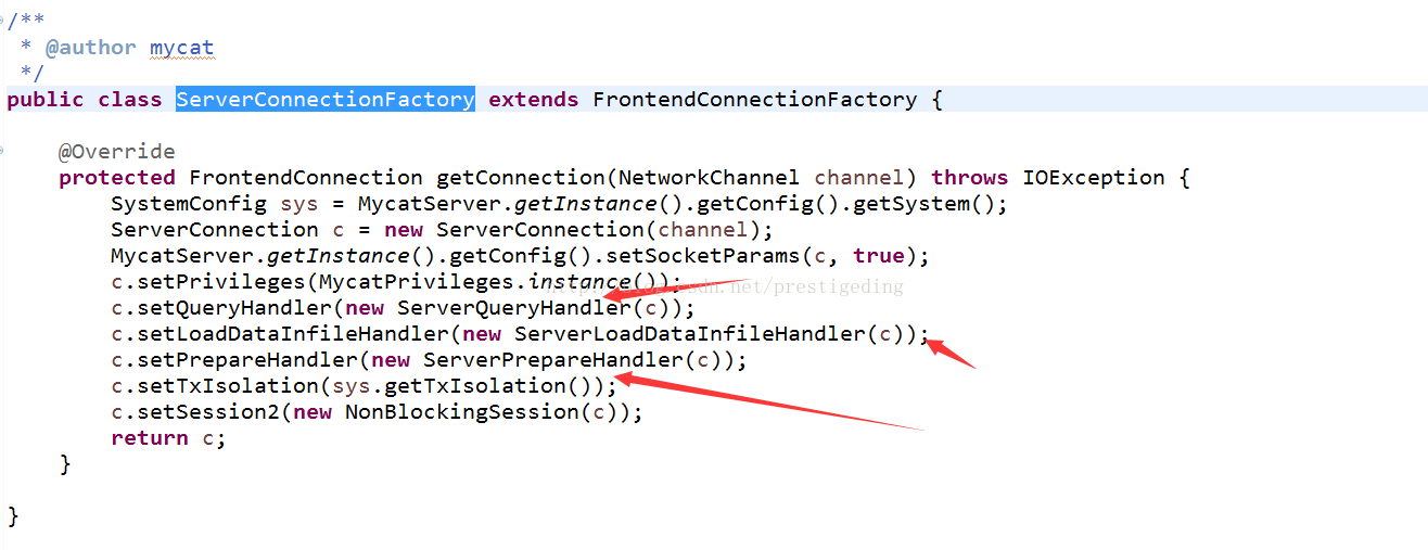 代码@1,将客户端的Socket连接,包装成Mycat的业务对象,Connection,Connection工厂的作用主要是初始化Socket相关参数,以及为通道关联相关的业务处理器(Handler)。稍候重点浏览一下工厂相关的代码。
