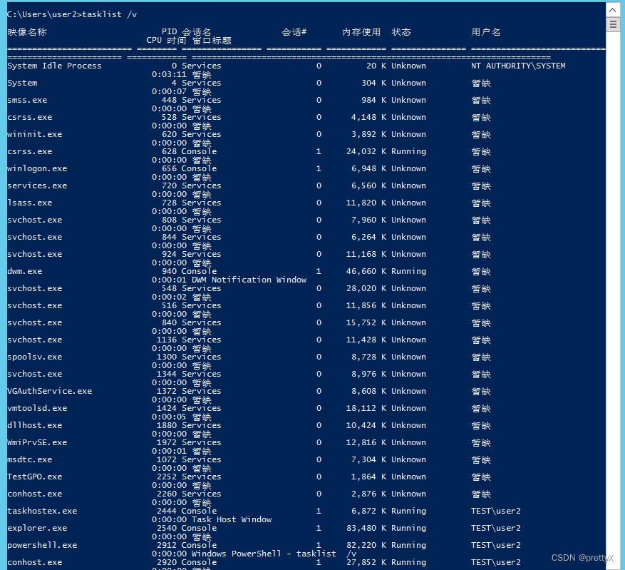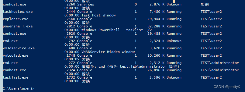 4、此时,我们再查看进程,存在用户为域管的进程,达到我们的测试条件