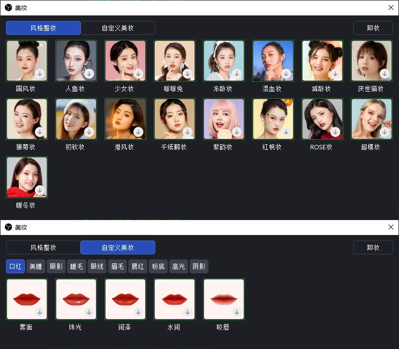 主播只需简单的化妆甚至不化妆,也不用去做头发,一切效果都可以通过OBS美颜插件实现美颜、美妆、口红、美瞳、眼影、腮红、高光、、美发、美型、美体、特效、口罩、遮罩等功能,在教程开始之前,先给大家看看效果。