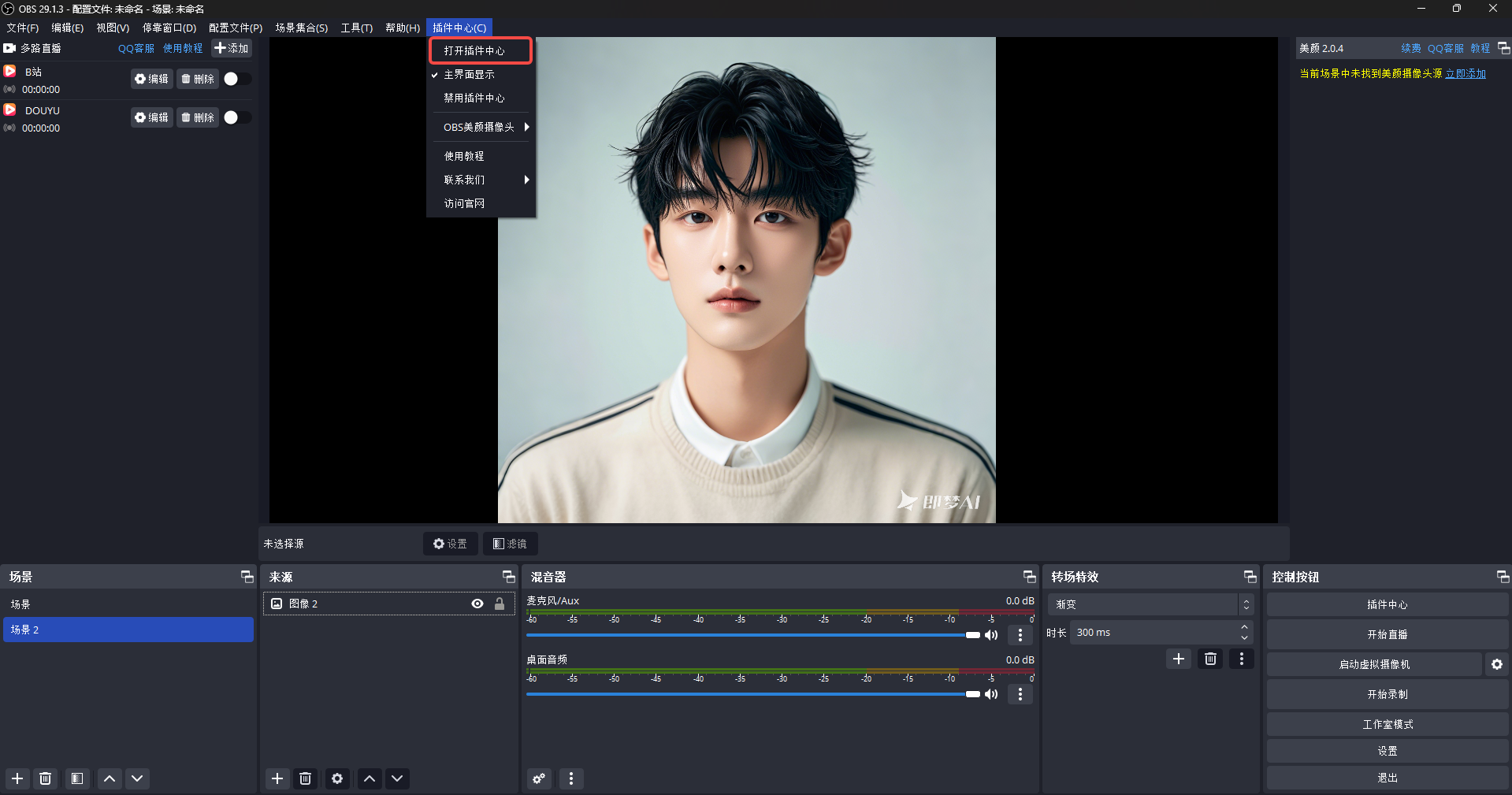 打开OBS直播软件,然后按要求登录插件中心,如下图所示: