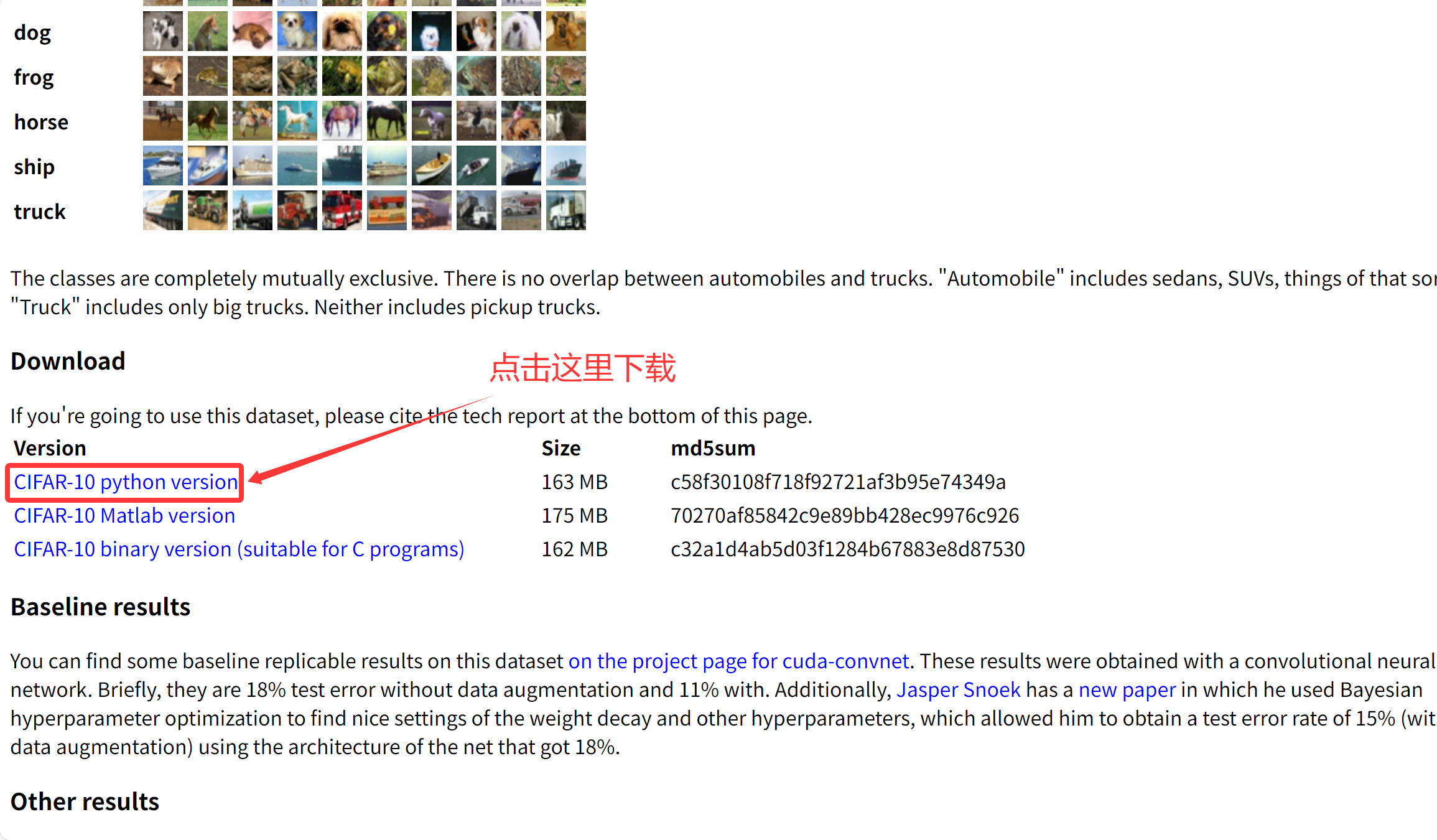 访问CIFAR-10官方网站:CIFAR-10 and CIFAR-100 datasets