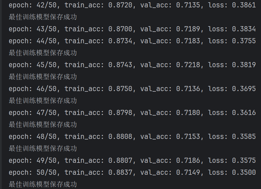 print(f'epoch: {epoch + 1}/{epoches}, train_acc: {train_acc:.4f}, val_acc: {val_acc:.4f}, loss: {avg_loss:.4f}')
