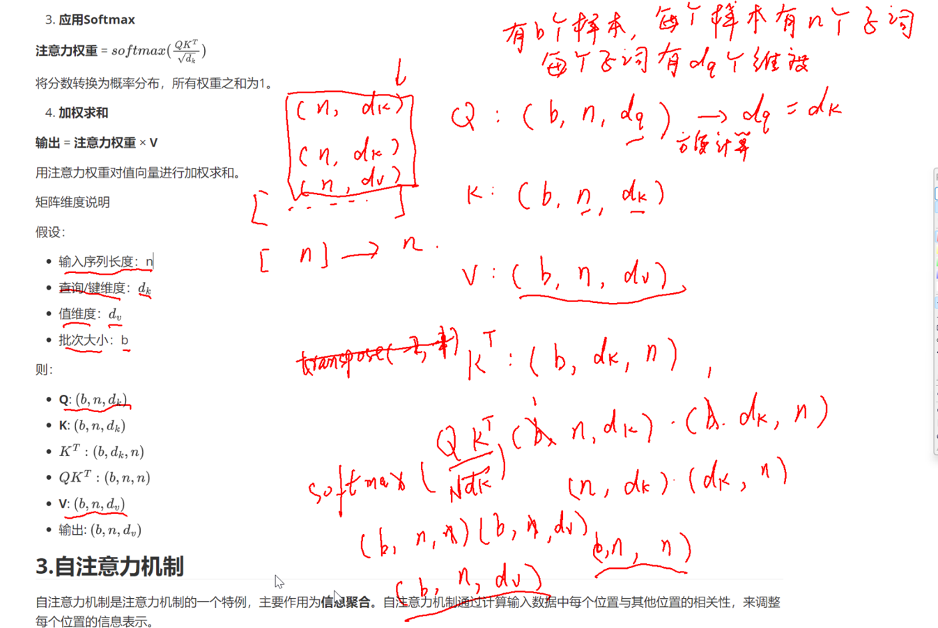 - K(键):每个 token 的 “键向量” 集合,和 Q 维度完全一致 —— 因为后续要做 “Q 与 K 的点积”(同维度向量才能算点积),所以必须都是 (b, n, d_k)。