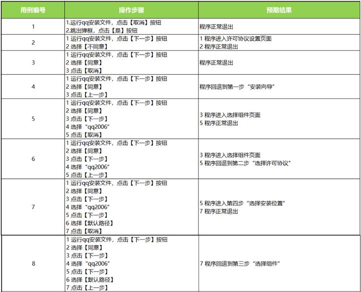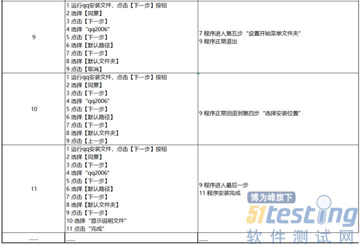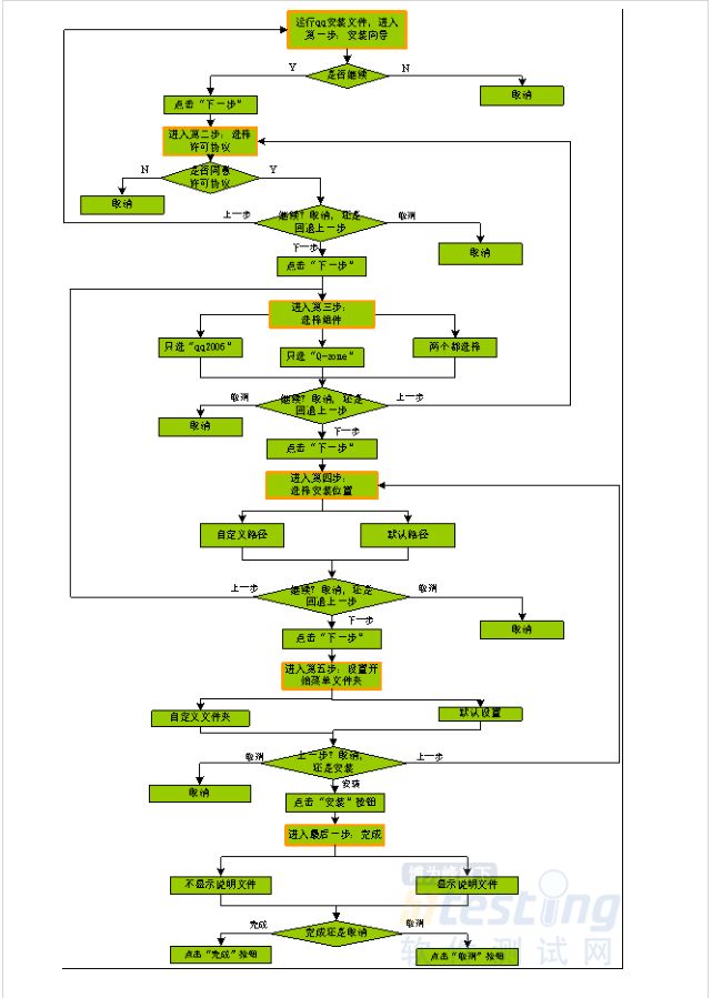 答案解析:看起来非常复杂的流程图和用例,设计的核心其实就两个方向,一个是正常流程,即安装安装向导一直点击【下一步】直到完成。另一个方向则是每个判断条件选择【否】的场景,那么这样的话,就会产生很多条其他分支的用例。