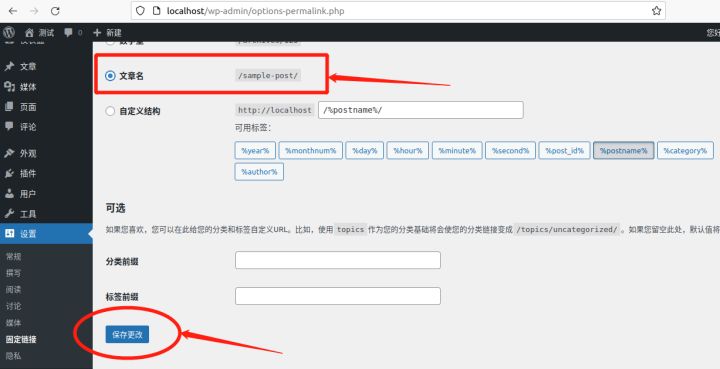 在这个页面,我们就能看到,可以将网站的固定链接更改为文章名,并在页面下方点击“保存更改”。