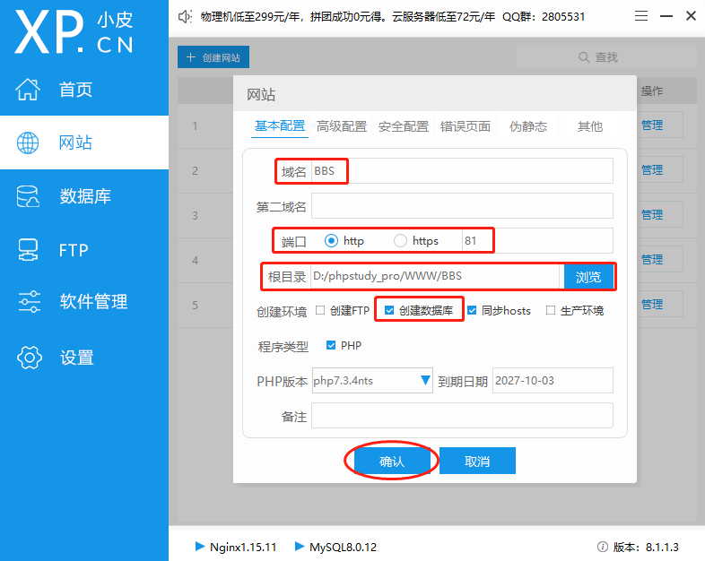各项支持软件准备完成后,就可以进行网页运行环境的构建。网页运行环境的构建主要为“域名”、“端口”、“网页根目录(即存放网页文件的位置)”、“创建数据库”几项。其中,创建数据库时确定的数据库名称、用户名和密码会在网页安装时用到,因此应妥善保存。