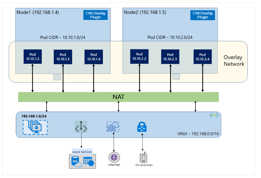 在覆盖网络中,Pod可以直接相互通信。离开集群的流量被源网络地址转换(Source NetworkAddress Translated,SNAT'd)为节点的IP地址,而入站的PodIP流量则通过一些服务路由,比如负载均衡器。这意味着podIP地址“隐藏”在节点的IP地址后面。这种方法减少了集群所需的VNetIP地址的数量。