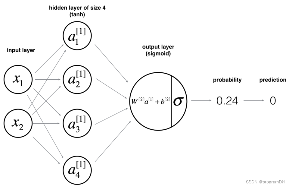 # 输入:“n_x, n_h, n_y”。输出=“W1, b1, W2, b2,参数”。