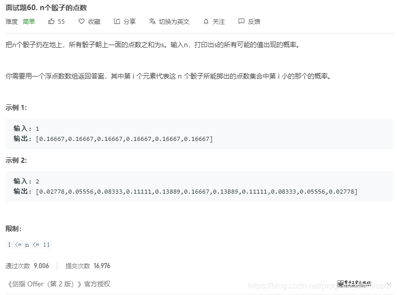 https://leetcode-cn.com/problems/nge-tou-zi-de-dian-shu-lcof/