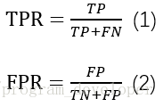 ROC曲线的纵轴是“真正例率”(True Positive Rate, 简称TPR),横轴是“假正例率”(False Positive Rate,简称FPR),基于上篇文章《错误率、精度、查准率、查全率和F1度量》的表1中符号,两者分别定义为: