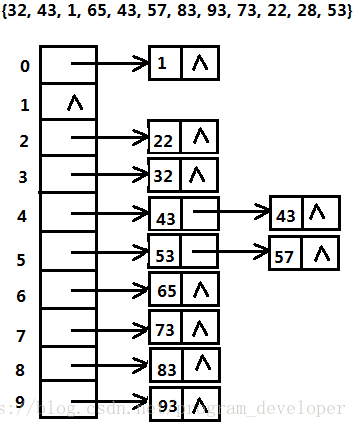 比如有数据{32, 43, 1, 65, 43, 57, 83, 93, 73, 22, 28, 53},这些数据在区间[0, 100)中,将这些数据分进十个桶中(注意:这里桶的数量是自己定义的),然后在这些桶中对其中的数据进行排序。如下图所示: