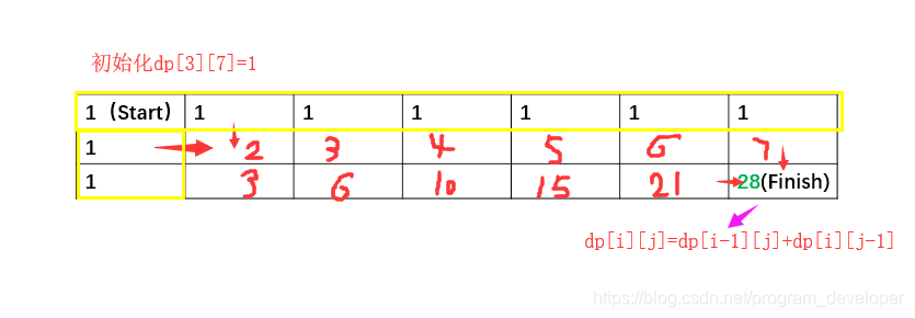 3. 状态转移方程:dp[i][j] = dp[i-1][j] + dp[i][j-1]