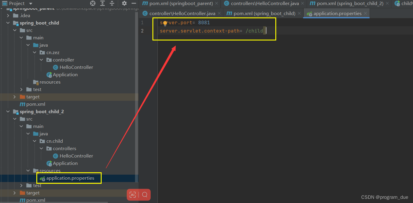 另一个子项目也写同样的代码进行测试,包路径不能相同而已,如果是多个子项目,那么需要在resource文件夹里加一个application.properties文件,里面配置端口,和虚拟路径,可以避免启动多子项目时端口冲突;配置如下