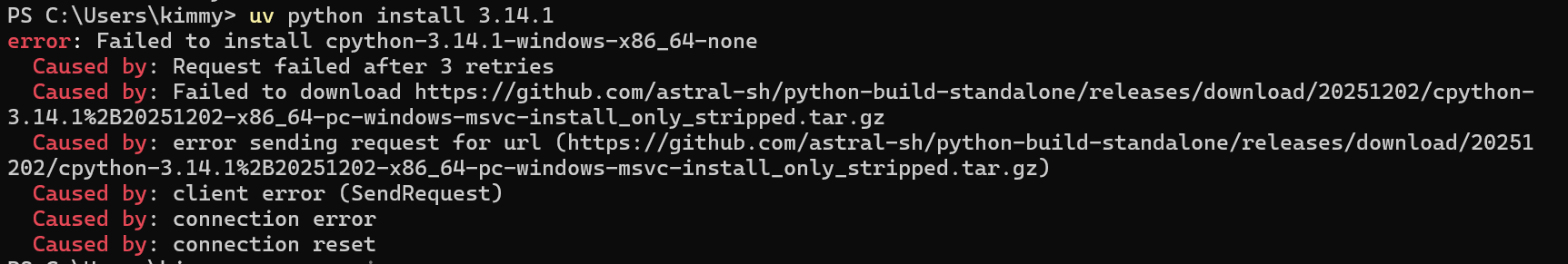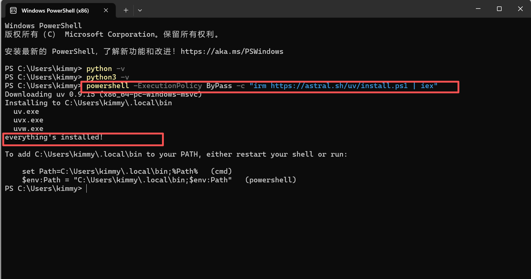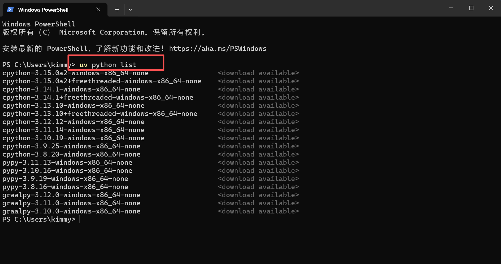检验:这里需要关闭powershell 重新打开一个执行command: uv python list