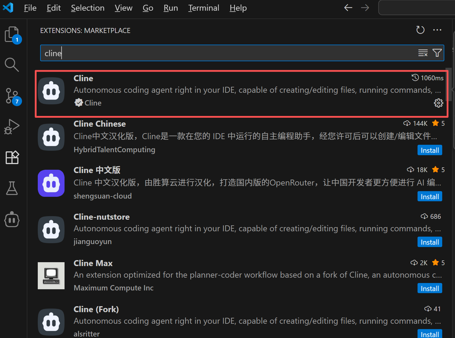 这里使用的是vscode ,大家自行下载,安装cline 插件。