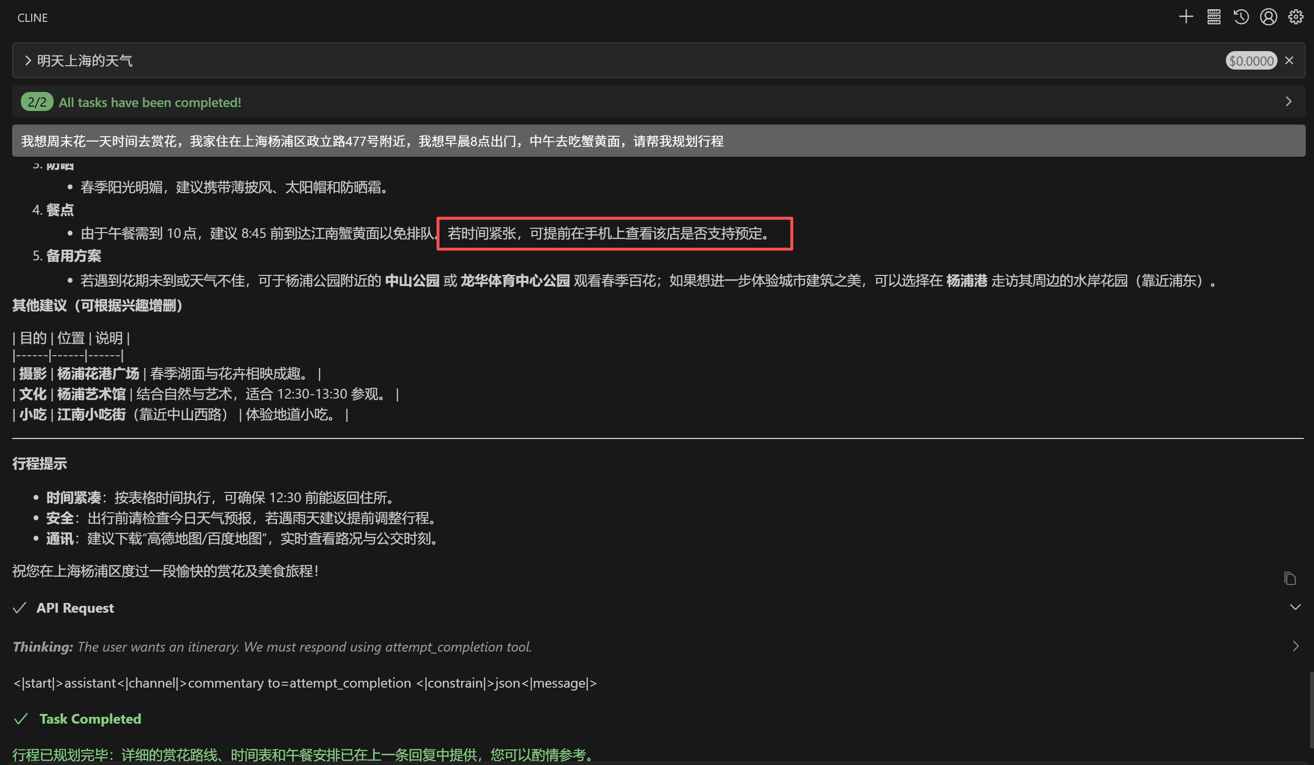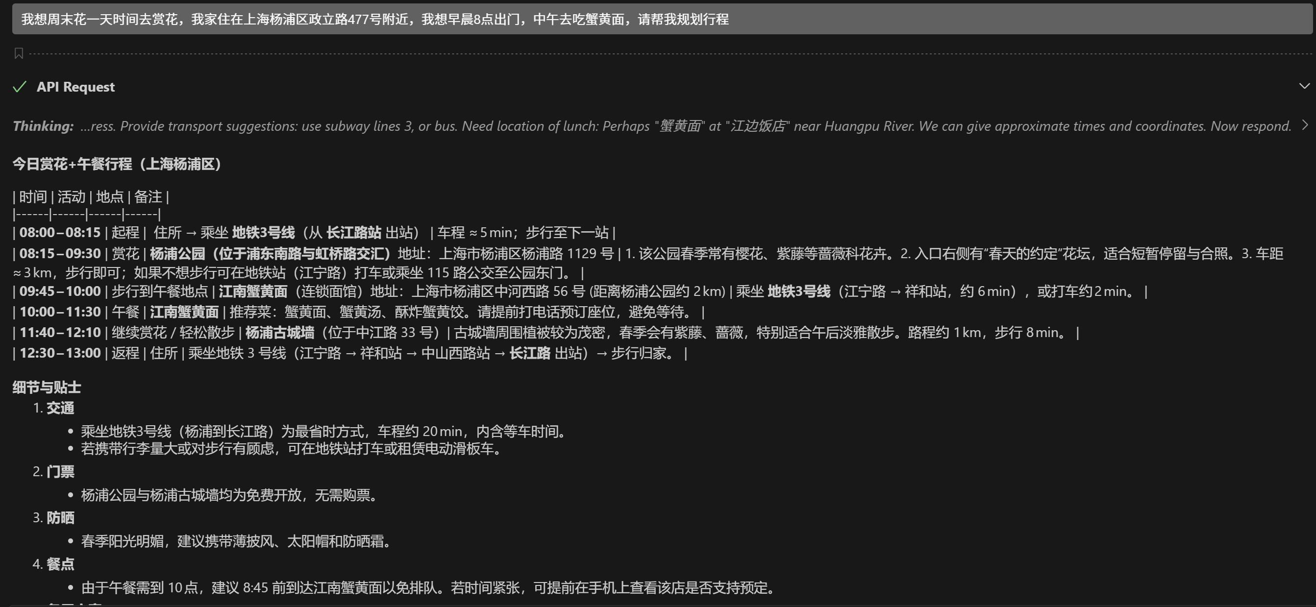 总结一下,这个答案选择的公园会更近一些。也会有一些比较贴心的提醒。也规划了返程的路线。