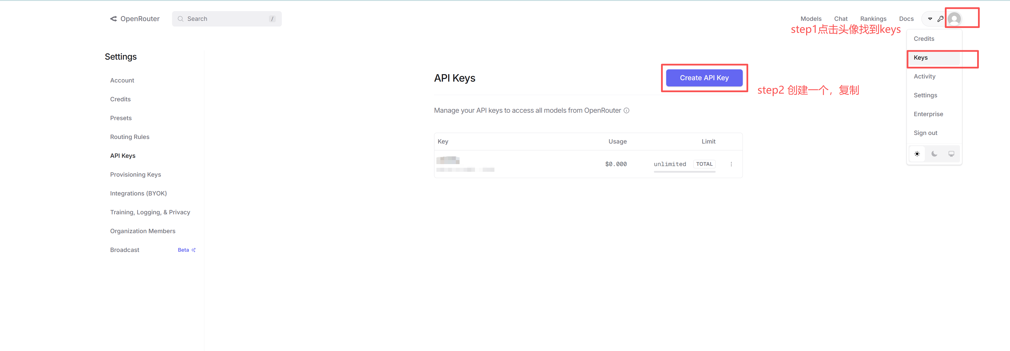 先登录OpenRouter网站 获取一个key 复制