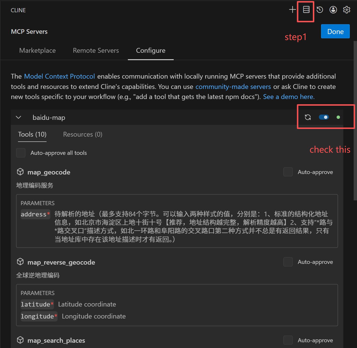 回到左边的cline ,查看一下是不是安装成功,并且把开关打开就行。windows 环境很多mcp 安装,通过修改json 文件方式可能会添加不成功,不过也可以通过手动安装。