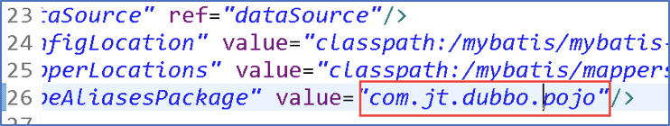 26行:<property name="typeAliasesPackage" value="com.jt.dubbo.pojo"/>