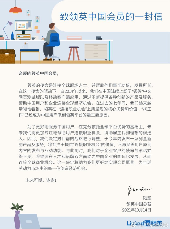 为了更好地服务中国用户,在充分依托全球平台优势的基础上,未来我们将更加专注地帮助用户连接职业机会,协助雇主找到理想的候选人。因此,我们决定对目前的战略进行调整,于今年内发布一系列全新的产品及服务,将专注干提供“连接职业机会”的价值,不再涵盖用户原创内容的发布与互动功能。与此同时,我们对于企业客户的使命与承诺始终不变,将继续在人才和品牌双方面助力中国企业的国际化发展,从而连接全球商业机会。这一决定将助力我们更好地实现公司愿景,为全球劳动力市场中的每一位创造经济机会。