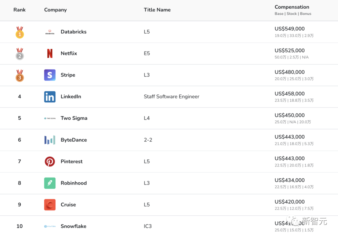 数据显示,字节跳动高级工程师年薪44.3万美元(303万元)位列第6,Roblox为首席工程师开出了120万美元(823万元)的天价。