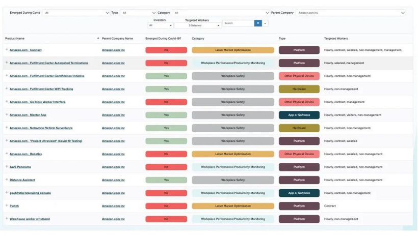 在这个数据库中,按照亚马逊作为技术所有权者来搜索,共有十几项办公效率 / 监控 / 辅助类和激励类软件或平台正在应用中,其中一半是早就在实施,另一半则是自疫情之后才发布上线的,主要都聚焦在员工绩效管理和工作安全管理领域。