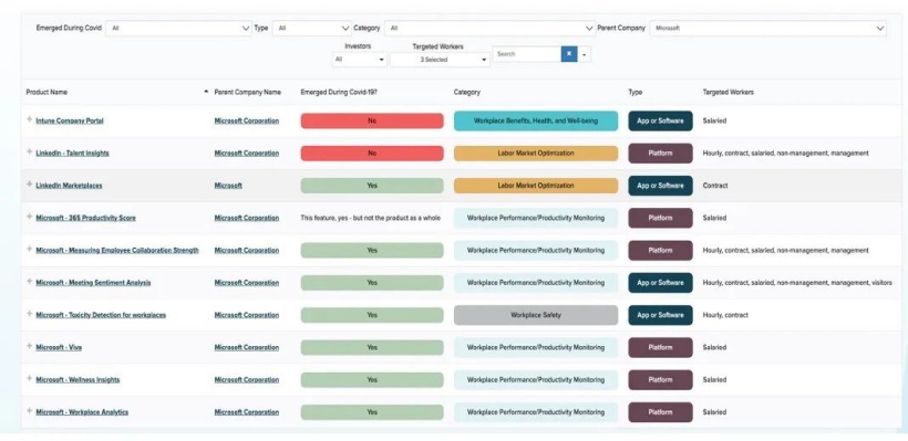 去年年底,美国雇员非营利组织 Coworker.org 就发布了一篇报告,总结了自 2018 年以来被各大公司使用的 550 多种以劳动力为中心的技术产品,并按照技术归属公司、技术工具类型、使用对象、是否在疫情期间出现等分类制作了一个详细的数据查询系统。这些技术工具中既包括了办公效率软件、行为监测软件也包括工资自动化类软件等等。其中,占比最高的就是绩效类、工作目标管理类的工具。
