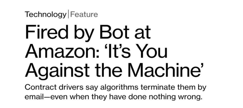 而去年,一位工作了 4 年、63 岁的配送司机因出现不可控失误而被算法冷血解雇的事件,还掀起了一场关于“人与机器对抗”的巨大的舆论争论,大家都在纷纷谴责亚马逊直接用算法裁员的做法未免太过“冷血”。