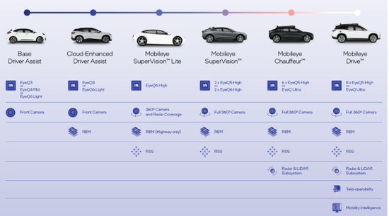 Mobileye提供一整套端到端的完全解决方案,包含四个属于L2、L2+级别的ADAS解决方案,以及两个属于L4级的AV解决方案。通俗的来讲,凭借一颗芯片、一个摄像头和一套算法这三件套,Mobileye开创性地实现了很多复杂的功能,如车道偏离预警、行人自动紧急制动、前方碰撞预警、自动巡航……