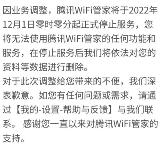 本月 5 日,腾讯 WiFi 管家发布了停服公告,称因业务调整,腾讯WiFi管家将在 2022 年 12 月 1 日零时零分正式停止服务。用户届时将无法使用腾讯 WiFi 管家的任何功能和服务。