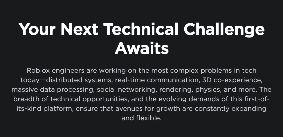 Roblox 工程师正在研究当今技术中最复杂的问题:分布式系统、实时通信、3D 协同体验、海量数据处理、社交网络、渲染、物理等等。