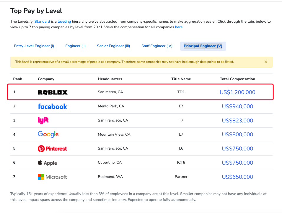 在这份薪资报告中,初级工程师岗位最高年薪为 226,000 美元,公司是 Netflix。主任工程师岗位,最高年薪为 646,000 美元,公司是 LinkedIn。而首席工程师岗位中报价最高的是 Roblox,达到了 1,200,000 美元年薪(约 800 万人民币)。