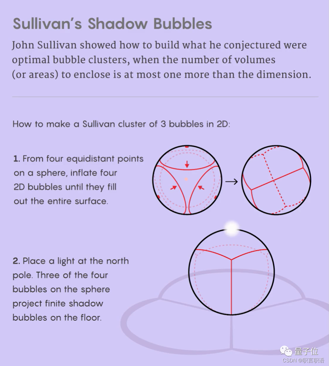 柏林工业大学教授约翰·马修·沙利文(John Matthew Sullivan)在上世纪90年代提出,只要气泡数量比空间维度大1个,就会有一种特殊的最佳方式来包住这些气泡,这种方式下投射出的气泡阴影,将会对应表面积最小的情况。