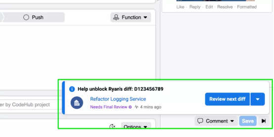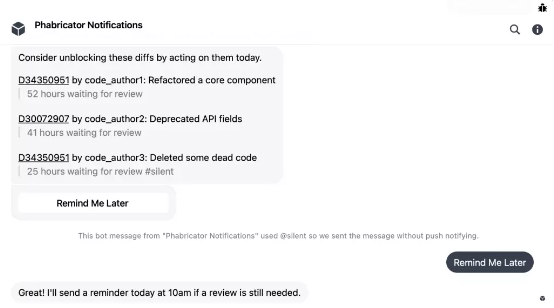 对于需要额外长时间审查的 diff,Nudgebot 会首先确定最适合的审查者子集,然后向他们发送一条聊天 ping,其中包含 diff 的部分上下文和快速跳转至审查流程的操作选项。