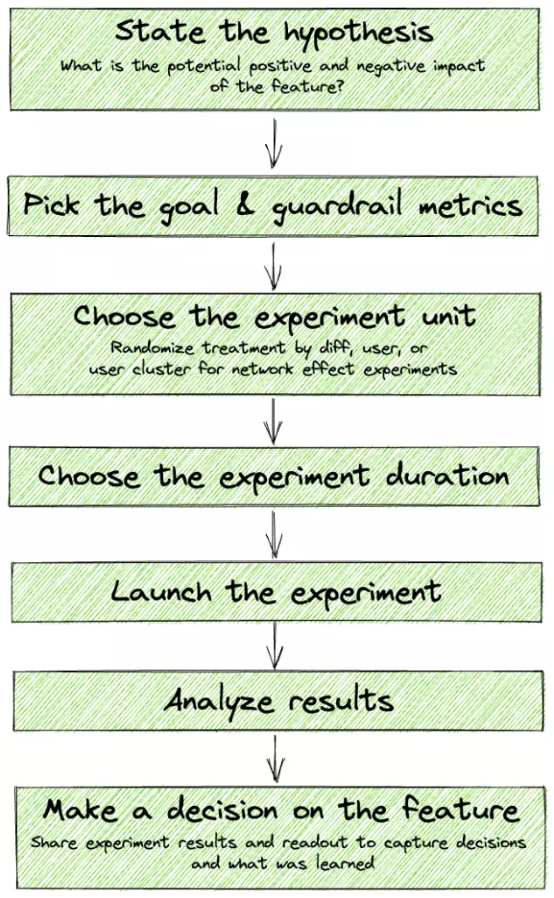 试验过程:根据对代码审查意义和体验设计的假设,选择了目标指标和护栏指标。此外还制定了一套选择不同实验单元以实现随机化抽样的机制,包括用户集群的随机化。