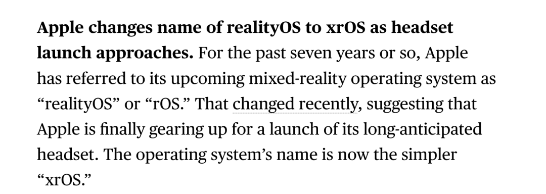 据马克·古曼介绍,在过去的七年研发历程中,苹果都将头显的操作系统命名为realityOS或rOS。但近期,来自内部的消息人士透露,该操作系统名称重新定为“xrOS”。
