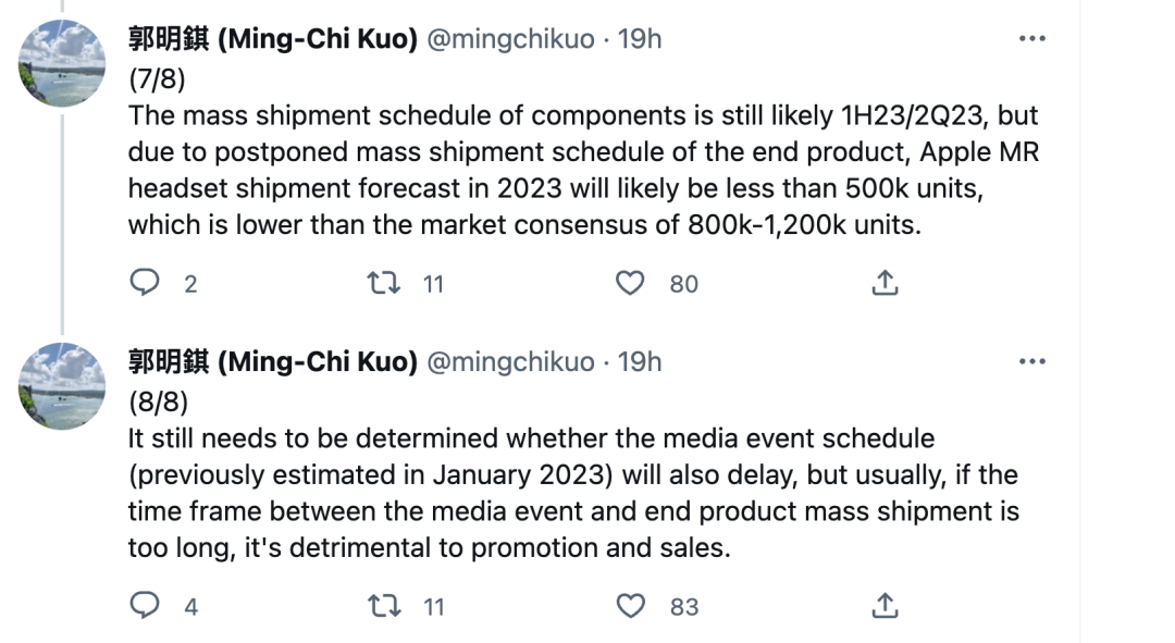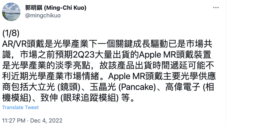 智东西12月5日报道,昨天大半夜,苹果分析师郭明錤连发8条推特,直接把苹果可能明年二季度要发的MR头显给“推到”明年底!