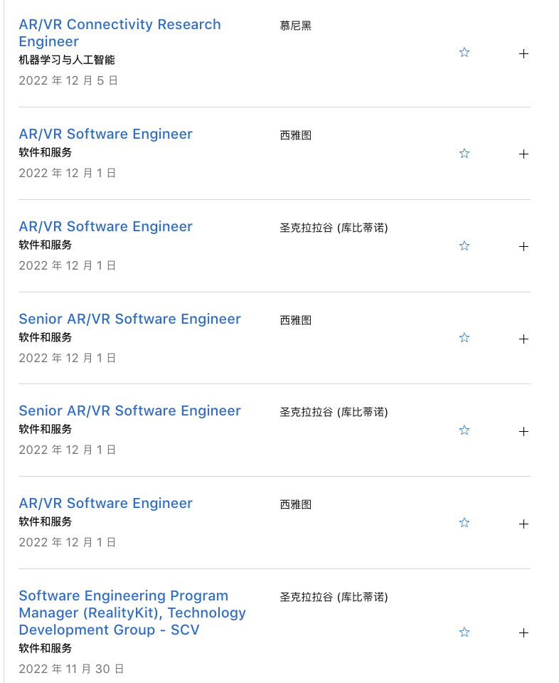 官网显示,苹果正在招聘大量涉及AR、VR开发人员,目前共招募158位与VR/AR领域相关的人才。在内容领域,苹果正寻找在虚拟效果和游戏资产领域有经验的软件开发人员。