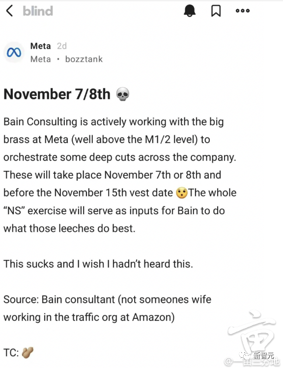 想当初,Meta在正式发起裁员之前,也有人发帖爆料称:「贝恩咨询正在为Meta制定大裁员计划,预计11月7-15之间动手」。