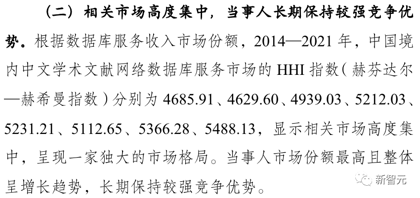 决定书中还列举了中文学术文献网络数据库服务这一细分市场的HHI指数,这是衡量市场集中度的重要指标,一般认为越接近10000,越接近垄断。知网为5488.13。