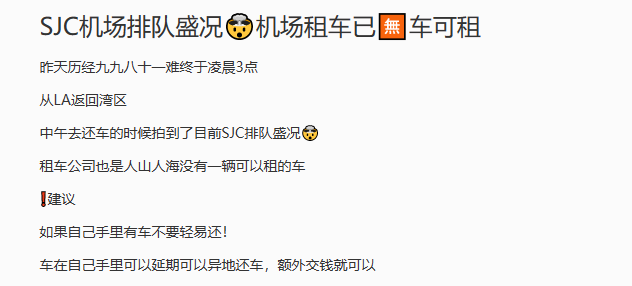 小红书上也有网友拍了视频,显示 SJC 排队的情况相当夸张,西南的队伍已经不仅已经排到了同一座航站楼的阿拉斯加门口,甚至往后还甩出了至少好几百人。更夸张的是租车公司也人山人海,“没有一辆可以租的车”(因为很多人航班被取消,改为租车出发)。