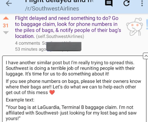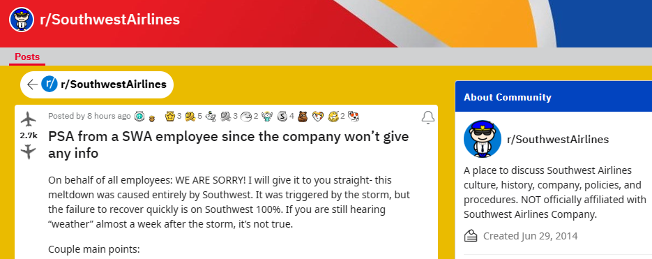 本周一,在 Reddit 的西南航空子版块(非官方)里,有一位自称为员工的匿名用户发了一条“非官方”版的情况说明,让大家更清楚地了解了目前西南航空内部究竟是一番怎样的崩溃景象,以及接下来应该如何做旅行安排计划。