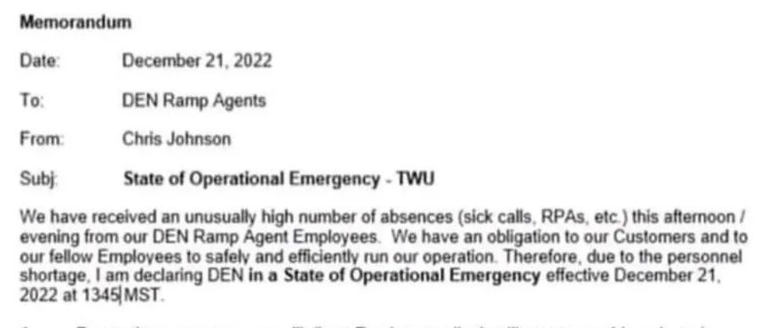 一份内部邮件显示,在12月21日,西南航空副总裁 Chris Johnson 在丹佛机场发布了运营紧急状态令(State of Operational Emergency)。