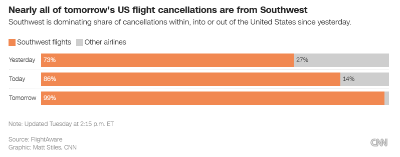 唯独西南航空成了异类:其取消的航班数量越来越多,整个航空公司从圣诞节的五天前开始陷入完全崩溃,直到圣诞节的三天后,仍然处于完全瘫痪的状态。