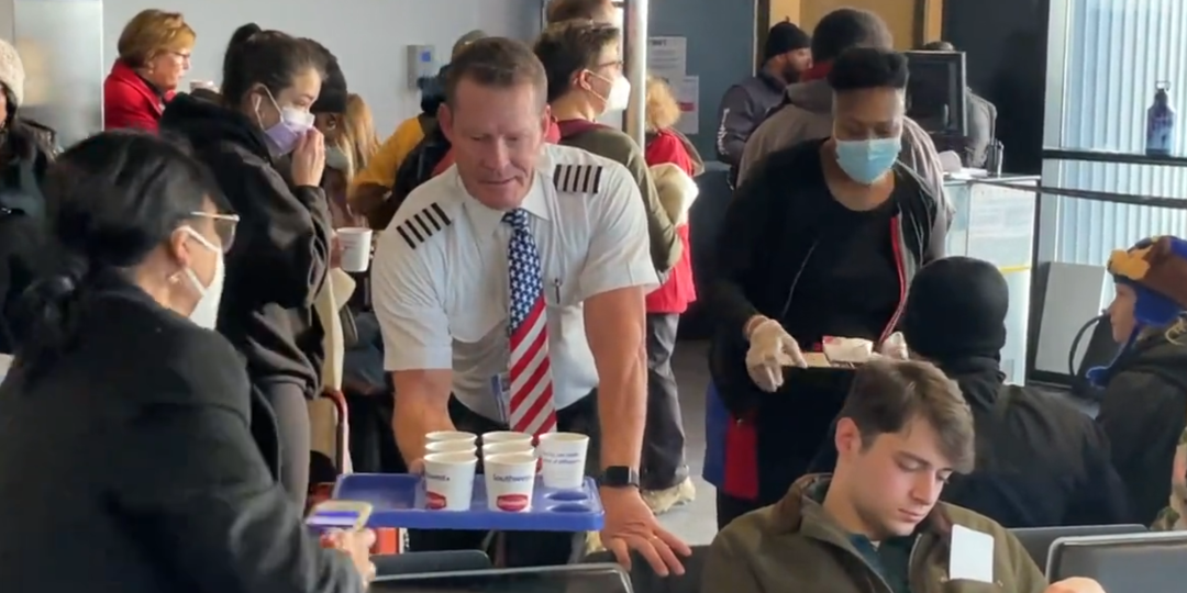 一位困在巴尔的摩的西南飞行员为同机乘客送来咖啡。 图片来源:@EricFlackTV