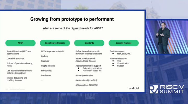 而 Android 工程总监 Lars Bergstrom 则说的更直接一点,「希望把 RISC-V 视为 Android 中的一级(tier 1)平台」,言下之意就是与 Arm 平起平坐。