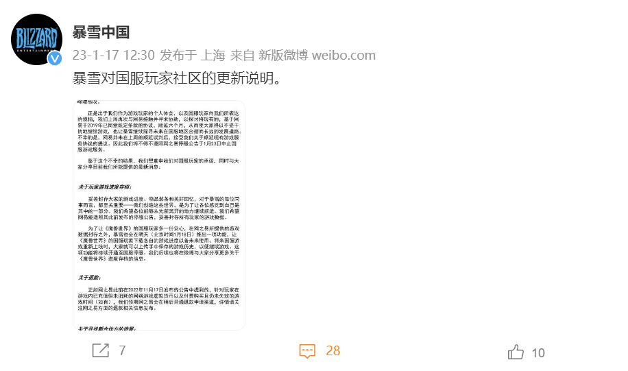 1 月 17 日消息,暴雪中国今日中午发布说明,对暴雪娱乐在国服地区的游戏服务状况作出说明。
