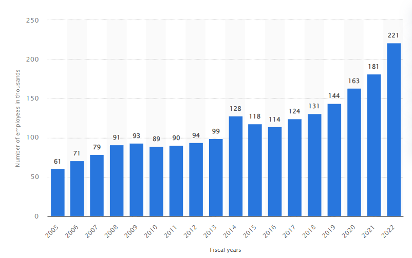 根据美国网站Statista公布的数据,截至去年6月30日,微软在全球拥有22.1万名员工,其中美国拥有12.2万名,海外有9.9万名,而5%的裁员比例意味着大约1.1万名微软员工将丢掉饭碗。