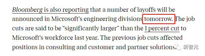 而彭博社的报道称,微软将首先在工程部门(Engineering Division)宣布裁员,时间就在明天!
